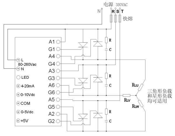 移相觸發(fā)器LSJK-T3SCRH)與6單向可控硅組成三相交流調(diào)壓接線圖