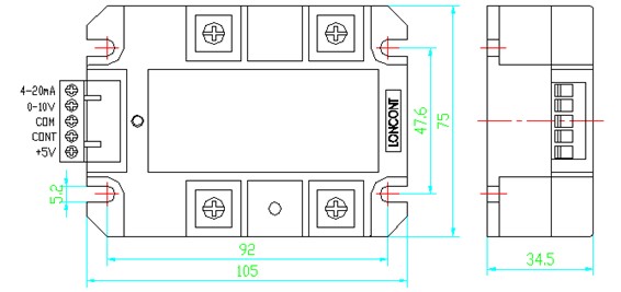 ②、0-5Vdc控制方式:按圖示,可接受單片機等的0-5Vdc模擬信號,控制輸入正極接cont端、負極接com端,模塊內(nèi)部cont端相對com端的輸入阻抗大于30KΩ。當(dāng)控制端cont從0-5Vdc改變時,交流負載上的電壓從0伏到最大值線性可調(diào),其中cont在0-0.7Vdc左右時為全關(guān)閉區(qū)域,可靠關(guān)斷整個電路的輸出;cont在0.7Vdc-4.3Vdc左右為可調(diào)區(qū)域,即隨著控制電壓的增大,交流負載上的電壓從0伏增大到最大值;cont在4.3Vdc-5Vdc左右時為全開通區(qū)域,交流負載上的電壓為最大值(接近電網(wǎng)電壓)。