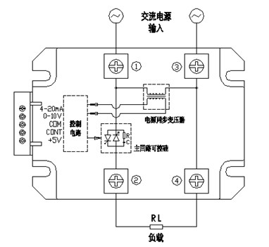 模塊內(nèi)部①②端為可控硅電路,分為一只雙向可控硅的普通型、兩只單相可控硅反并聯(lián)的增強型。模塊內(nèi)部③④端為導(dǎo)線直通端,內(nèi)部①③端之間接有電源同步變壓器。