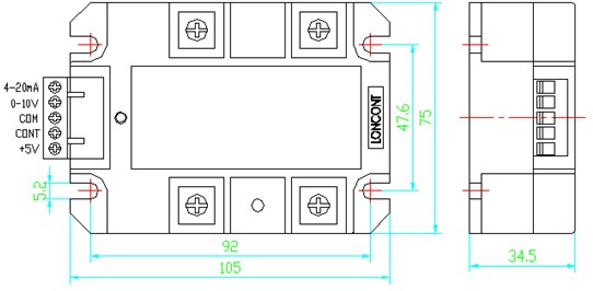 ②、0-5Vdc控制方式:按圖示,可接受0-5Vdc模擬信號(hào),控制輸入正極接cont端、負(fù)極接com端,模塊內(nèi)部cont端相對(duì)com端的輸入阻抗大于30KΩ。當(dāng)控制端cont從0-5Vdc改變時(shí),直流負(fù)載上的電壓從0伏到最大值線(xiàn)性可調(diào),其中cont在0-0.7Vdc左右時(shí)為全關(guān)閉區(qū)域,可靠關(guān)斷整個(gè)電路的輸出;cont在0.7Vdc-4.3Vdc左右為可調(diào)區(qū)域,即隨著控制電壓的增大,移相角α從180°到0°線(xiàn)性減小,導(dǎo)通角增大,負(fù)載上的電壓從0伏增大到最大值;cont在4.3Vdc-5Vdc左右時(shí)為全開(kāi)通區(qū)域,負(fù)載上的電壓為最大值(相當(dāng)于電網(wǎng)電壓直接橋式整流)。