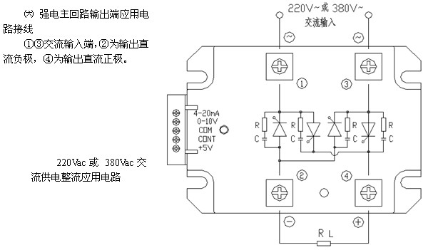 ④、4-20mA控制方式:按圖示,可接受4-20mA模擬信號(hào),模塊內(nèi)部4-20mA端相對(duì)com端的輸入阻抗為250Ω。當(dāng)以4-20mA控制輸入時(shí),4-5mA左右時(shí)為全關(guān)閉區(qū)域,可靠關(guān)斷整個(gè)電路的輸出;5-19mA左右為可調(diào)區(qū)域,即隨著控制電流的增大,移相角α從180°到0°線(xiàn)性減小,負(fù)載上的電壓從0伏增大到最大值;19-20mA左右時(shí)為全開(kāi)通區(qū)域,輸出最大。