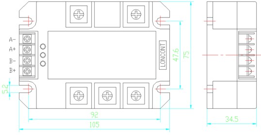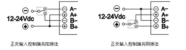 5、輸入控制電壓為12-24Vdc,共陽或共陰可任意接線?刂凭共陽連接時,A—、B—端低電平有效,當A—、B—端同時為低電平時模塊自動關閉。共陰連接時,A+、B+端高電平有效,當A+、B+端同時為高電平時模塊自動關閉。其他控制電壓也可定制。