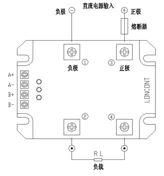 ①和③腳為電源輸入的負極和正極,②④腳接直流電機負載。必要時可接入快速熔斷器