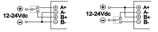 7、輸入控制電壓為12-24Vdc,共陽或共陰可任意接線?刂凭共陽連接時,A—、B—端低電平有效,當A—、B—端同時為低電平時模塊自動關閉。共陰連接時,A+、B+端高電平有效,當A+、B+端同時為高電平時模塊自動關閉。其他控制電壓也可定制。