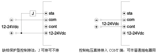當(dāng)三相電源發(fā)生缺相(缺一相或二相)或斷相,繼電器會迅速切斷輸出,關(guān)閉工作,進(jìn)入自鎖狀態(tài),直至切斷輸入控制電源,重新加控制電。繼電器內(nèi)置狀態(tài)(STA)輸出端子,為集電極開路式,可外接工作電壓3-24Vdc的直流指示燈、蜂鳴器、繼電器,或與其它自動控制設(shè)備連接,作報警提示。若將控制電壓直接輸入CONT端,則也可作普通三相交流固態(tài)繼電器使用。